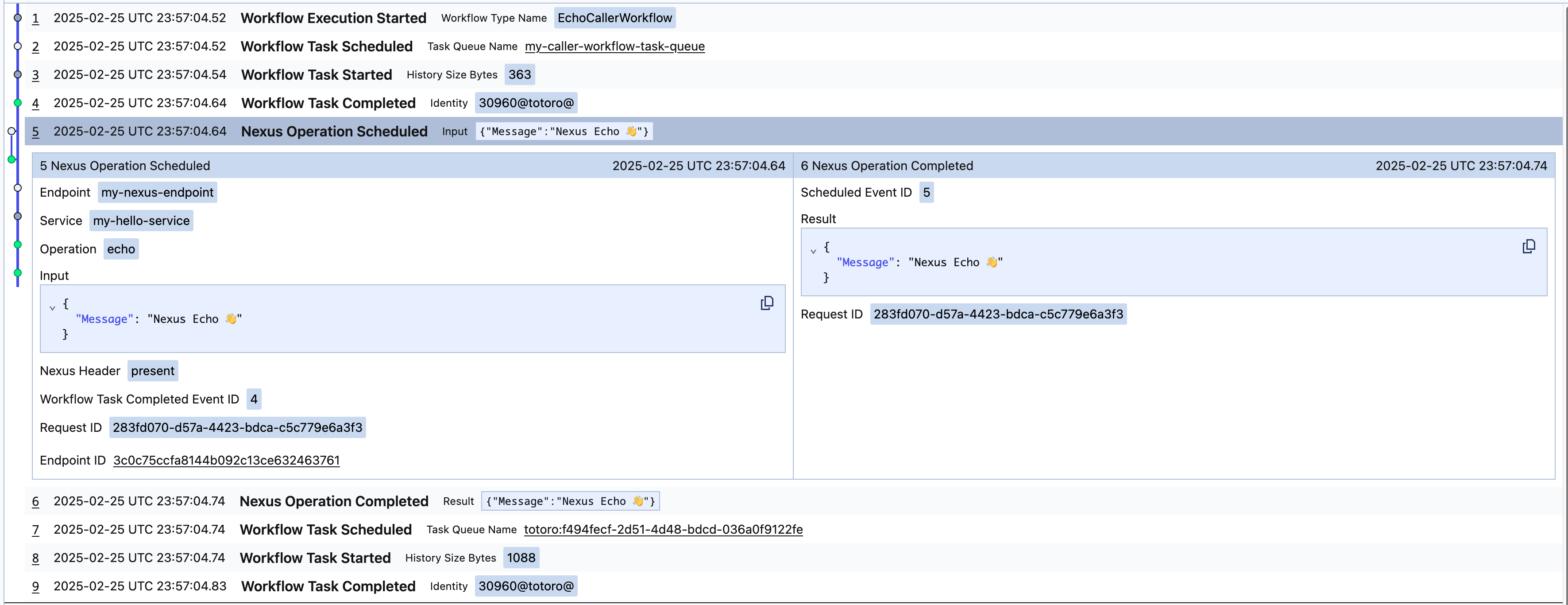 A synchronous Nexus Operation will surface in the caller Workflow as follows, with just NexusOperationScheduled and NexusOperationCompleted events in the caller's Workflow history: